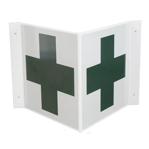 Ensiapu merkki V-kilpipohjalla, heijastava. Merkki sopii sisätiloihin, jossa se on nähtävissä useammasta suunnasta.