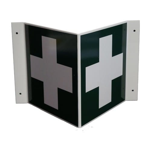 Ensiapu merkki V-kilpipohjalla. Merkki sopii sisätiloihin, jossa se on nähtävissä useammasta suunnasta.