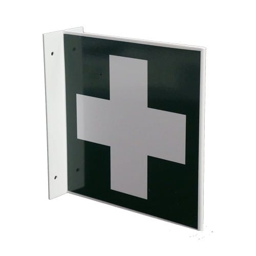 Ensiapu merkki L-kilpipohjalla. Merkki sopii sisätiloihin, jossa se on nähtävissä useammasta suunnasta.
