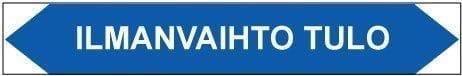 Putkistojen ainetta ja kulkusuuntaa merkitsevä tarra. Kulkusuunnasta riippuen toinen kärki leikataan pois.