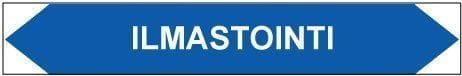 Putkistojen ainetta ja kulkusuuntaa merkitsevä tarra. Kulkusuunnasta riippuen toinen kärki leikataan pois.
