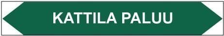 Putkistojen ainetta ja kulkusuuntaa merkitsevä tarra. Kulkusuunnasta riippuen toinen kärki leikataan pois.