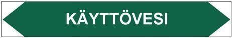 Putkistojen ainetta ja kulkusuuntaa merkitsevä tarra. Kulkusuunnasta riippuen toinen kärki leikataan pois.