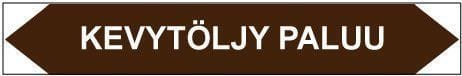 Putkistojen ainetta ja kulkusuuntaa merkitsevä tarra. Kulkusuunnasta riippuen toinen kärki leikataan pois.