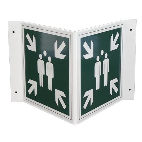 Kokoontumispaikka merkki V-kilpipohjalla, heijastava. Merkki sopii sisätiloihin, jossa se on nähtävissä useammasta suunnasta.