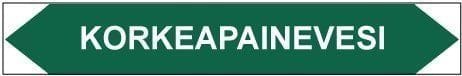 Putkistojen ainetta ja kulkusuuntaa merkitsevä tarra. Kulkusuunnasta riippuen toinen kärki leikataan pois.