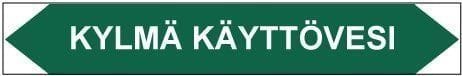Putkistojen ainetta ja kulkusuuntaa merkitsevä tarra. Kulkusuunnasta riippuen toinen kärki leikataan pois.