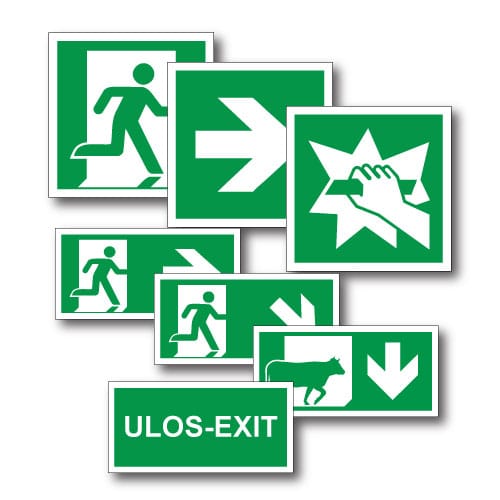 Jälkivalaisevilla kylteillä merkitään esim. poistumistiet. Samoin alkusammutus- ja ensiapuvälineiden paikka kannattaa merkitä jälkivalaisevalla kilvellä.