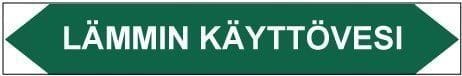 Putkistojen ainetta ja kulkusuuntaa merkitsevä tarra. Kulkusuunnasta riippuen toinen kärki leikataan pois.