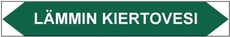 Putkistojen ainetta ja kulkusuuntaa merkitsevä tarra. Kulkusuunnasta riippuen toinen kärki leikataan pois.