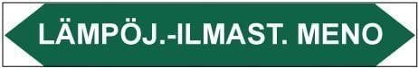Putkistojen ainetta ja kulkusuuntaa merkitsevä tarra. Kulkusuunnasta riippuen toinen kärki leikataan pois.