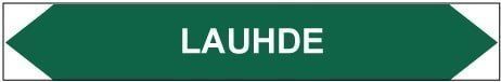 Putkistojen ainetta ja kulkusuuntaa merkitsevä tarra. Kulkusuunnasta riippuen toinen kärki leikataan pois.