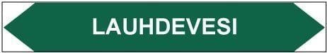 Putkistojen ainetta ja kulkusuuntaa merkitsevä tarra. Kulkusuunnasta riippuen toinen kärki leikataan pois.