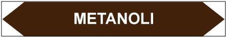 Putkistojen ainetta ja kulkusuuntaa merkitsevä tarra. Kulkusuunnasta riippuen toinen kärki leikataan pois.