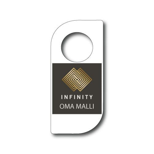 Edullinen ovenkahvaripustin omalla tekstilläsi tai suunnitelmallasi. Ovenkahvaripustin on taipuisaa 1 mm muovia johon on asennettu päälle laminoitu tarra. Ripustimet kestävät hyvin myös ulko-olosuhteita.