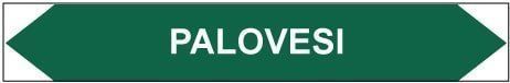 Putkistojen ainetta ja kulkusuuntaa merkitsevä tarra. Kulkusuunnasta riippuen toinen kärki leikataan pois.