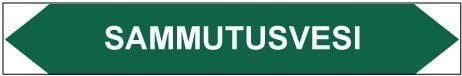 Putkistojen ainetta ja kulkusuuntaa merkitsevä tarra. Kulkusuunnasta riippuen toinen kärki leikataan pois.