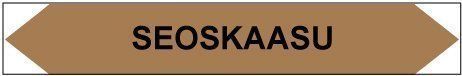 Putkistojen ainetta ja kulkusuuntaa merkitsevä tarra. Kulkusuunnasta riippuen toinen kärki leikataan pois.