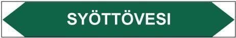 Putkistojen ainetta ja kulkusuuntaa merkitsevä tarra. Kulkusuunnasta riippuen toinen kärki leikataan pois.